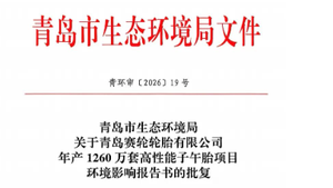 日前,青岛市生态环境局正式批复青岛赛轮轮胎有限公司年产1260万套高性能子午胎项目环境影响报告书。该项目选址青岛董家口化工产业园,总投资23.4亿元,其中环保投资1200万元,占地面积约21.91公顷(合328.65亩)。