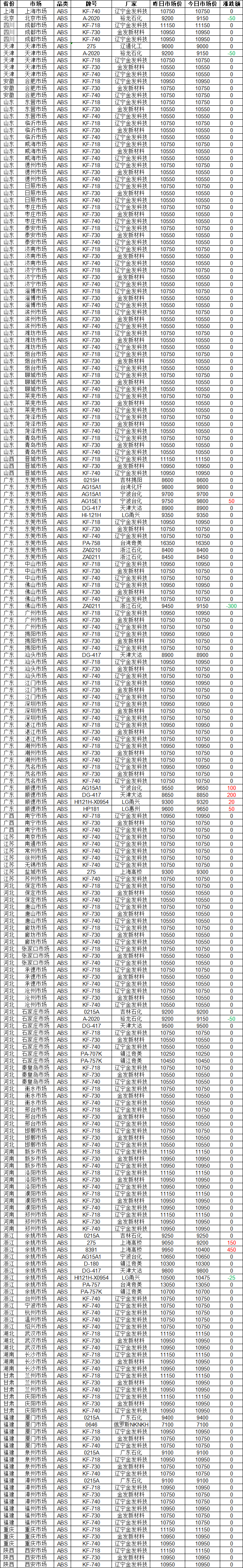 Daily ABS Market Review According to ZS Vision statistics, as of 16:00 on February 2nd, ABS markets across the country showed mixed movements! 3% of quotes rose, 2% of quotes fell, with the highest increase of 450 yuan and the largest decrease of 300