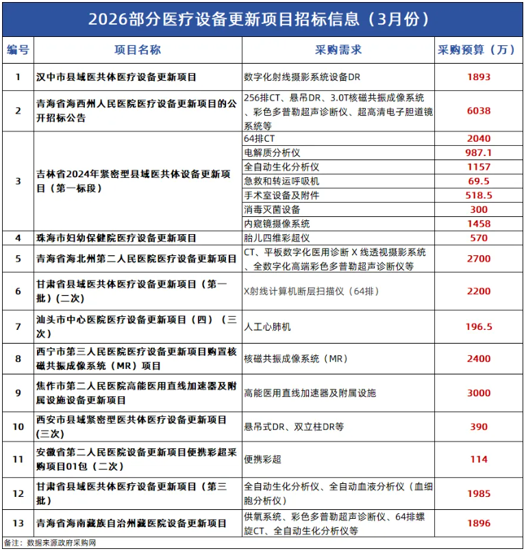 Recently, a batch of medical equipment renewal projects announced on the China Government Procurement Network, with a total budget of nearly 300 million yuan, covers a rich variety of popular products such as 256-slice CT, fully automatic biochemica
