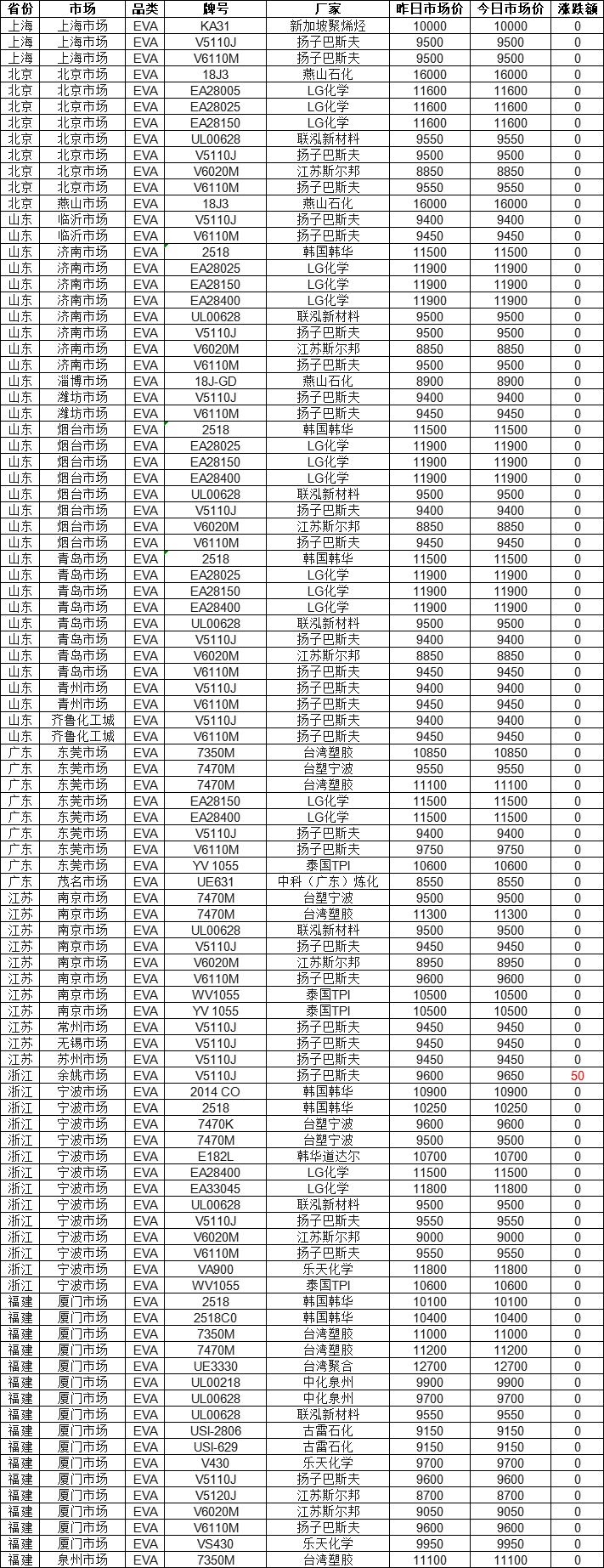 Today's EVA market commentary: As of 16:00 on January 7th, the EVA market across all regions in the country showed stability with some increases. 99% of the market quotes remained stable, with a maximum increase of 50 yuan. Currently, the Yangzi-BASF