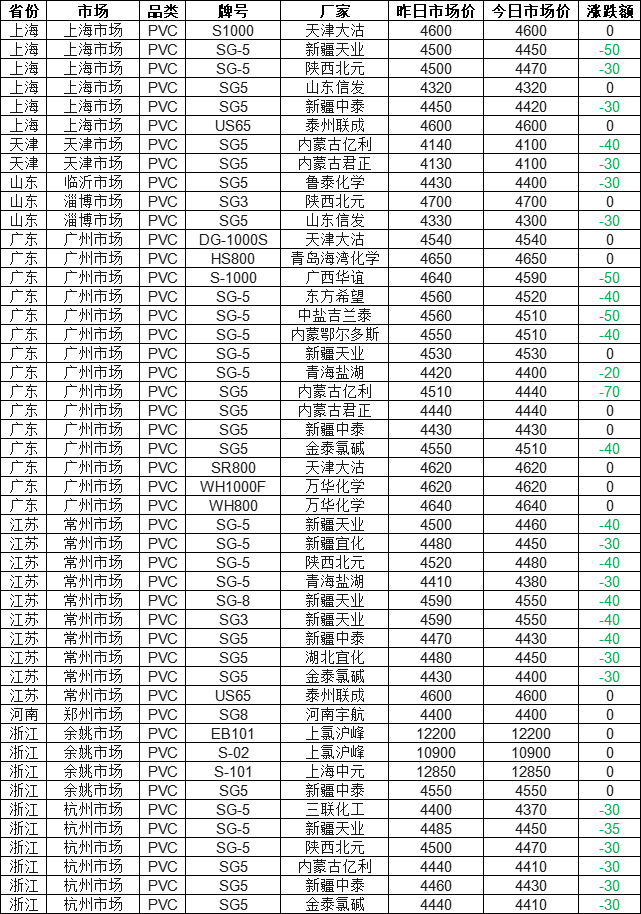 Today's PVC Market Brief: According to statistics from Zhuangsu Shijie, as of 16:00 on December 19, the PVC market in most regions across the country is showing a green trend! 62% of the market quotes have decreased, with the largest drop being 70 yu