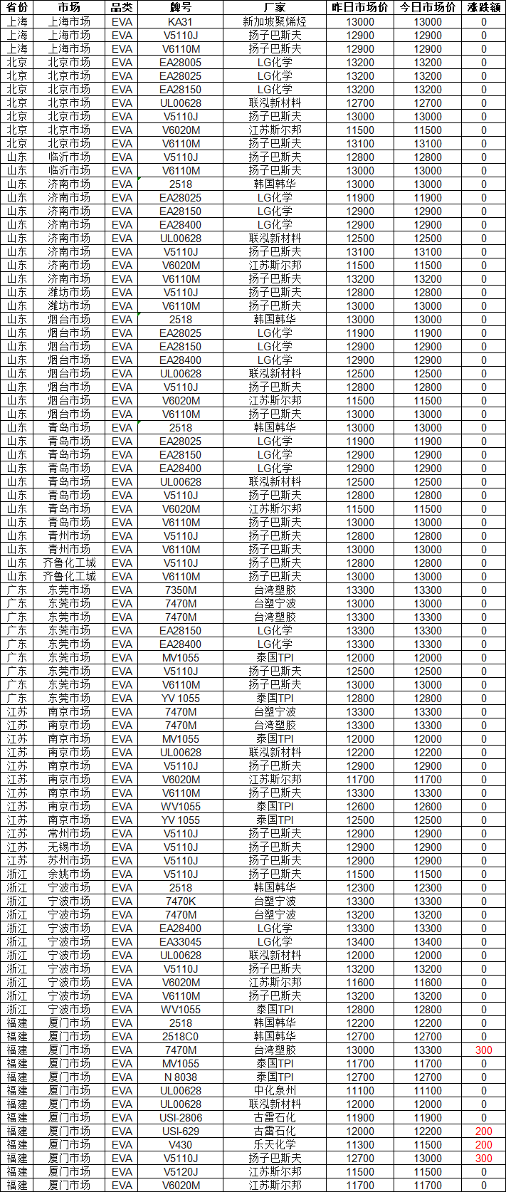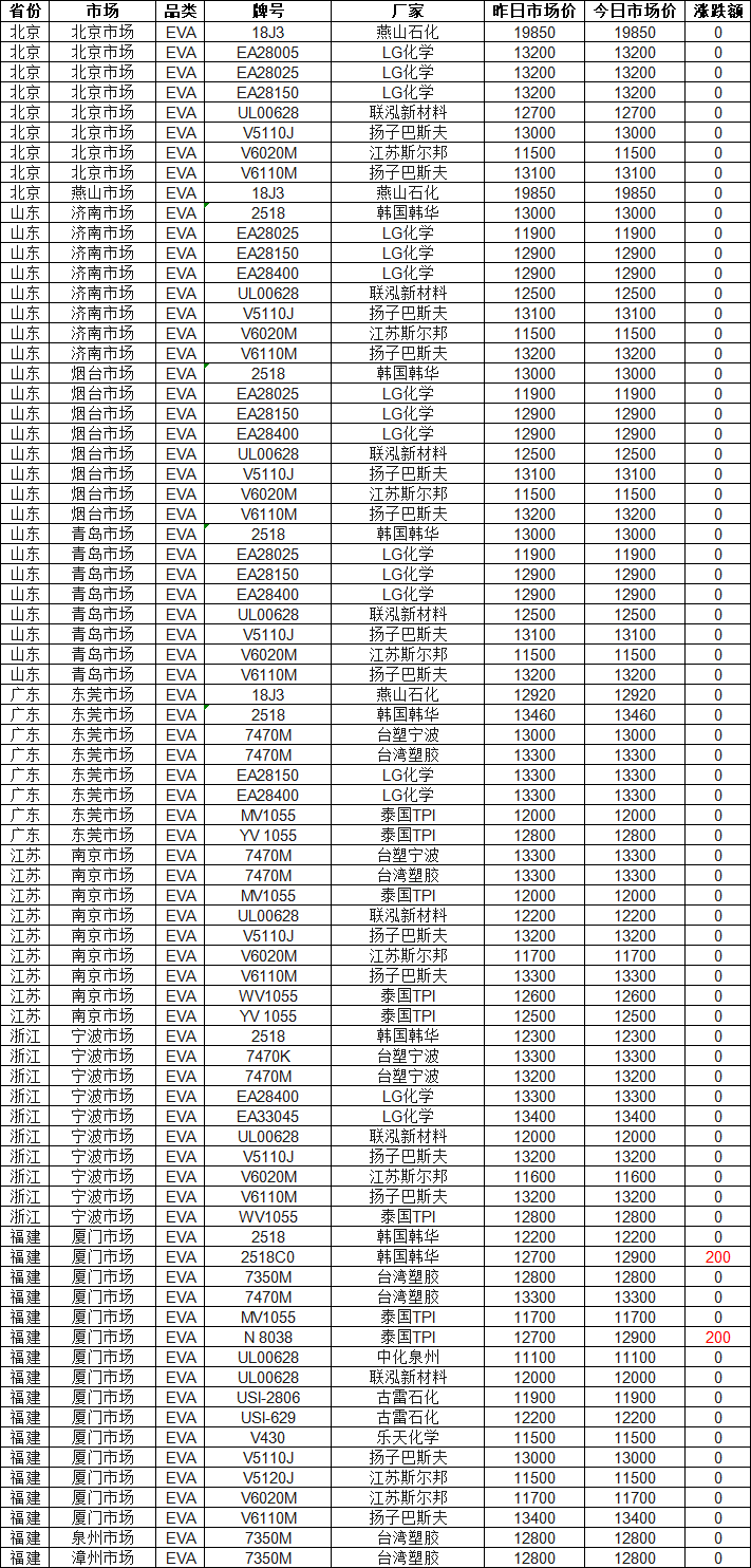 Today's EVA Market Brief: According to the Zhusu World statistics, as of 4:00 PM on March 19, the EVA market in various regions across the country has been stable with a slight increase! 97% of the market quotes remain stable, with the highest increa