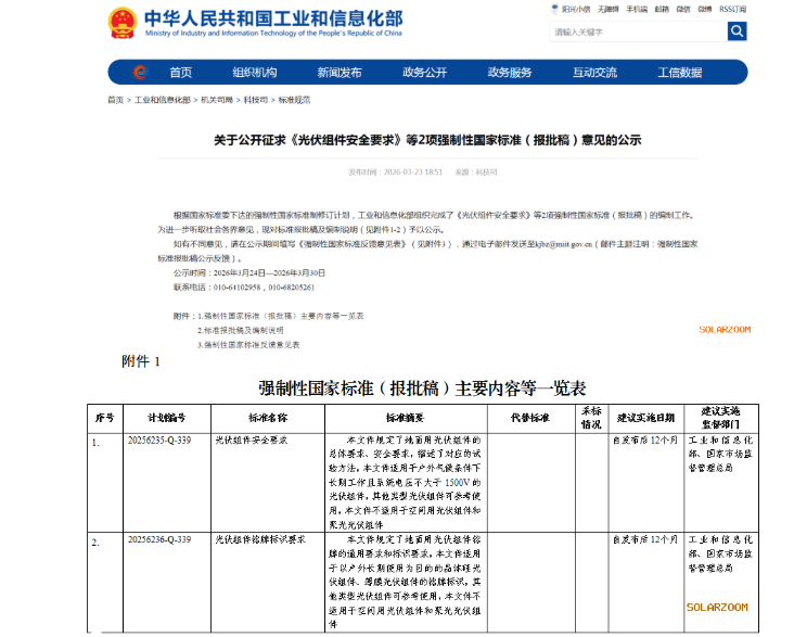 On March 24, the MIIT released a notice on the public solicitation of comments on the draft mandatory national standards "Safety Requirements for Photovoltaic Modules" and "Labeling Requirements for Photovoltaic Modules". Among these, the "Safety Req