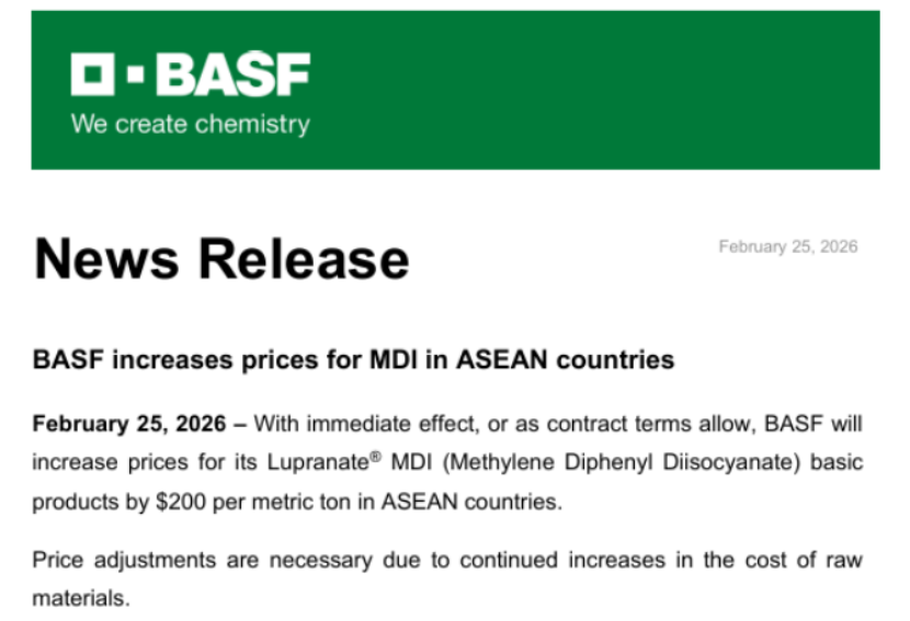 International News Briefing: Raw Material News-BASF announces price increase in ASEAN regionMDI product prices -MG became the first Chinese automobile brand to achieve over one million sales in Europe. Electronic News-Nova Chemicals Capacity Expansi