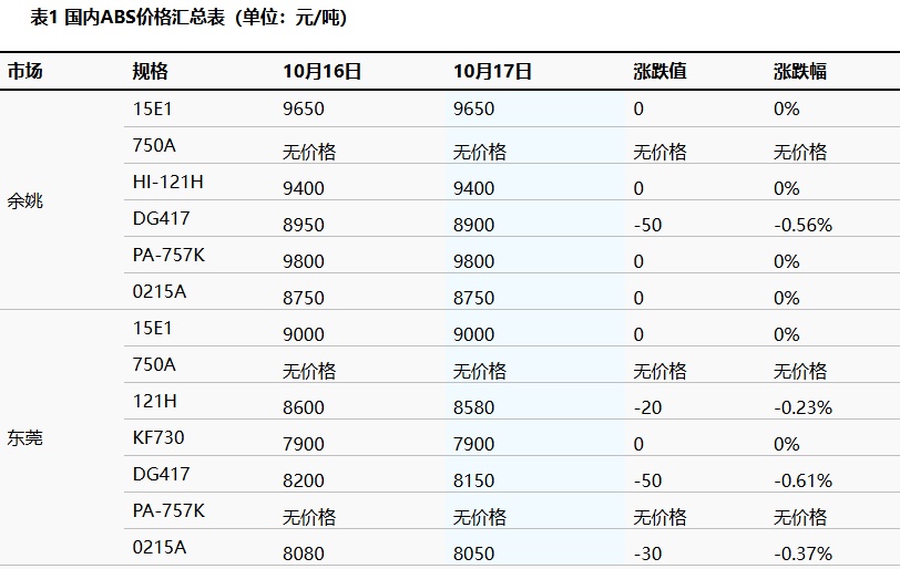 Abstract:On October 17th, the price and forecast summary for general-purpose plastics and engineering plastics markets is as follows. In the general-purpose plastics sector, market sentiment is weak, with PP and PE experiencing narrow fluctuations; P