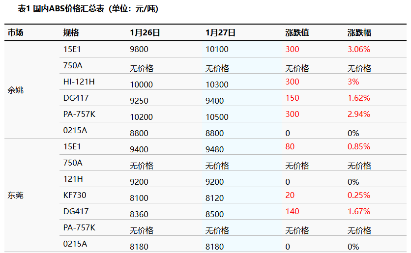 1 Today's Summary: East China market prices rose today; South China market prices rose, and market transactions were fair today. ②ABS monthly output decreased month-on-month in January. 2 Spot Market Overview Based on Yuyao and Dongguan