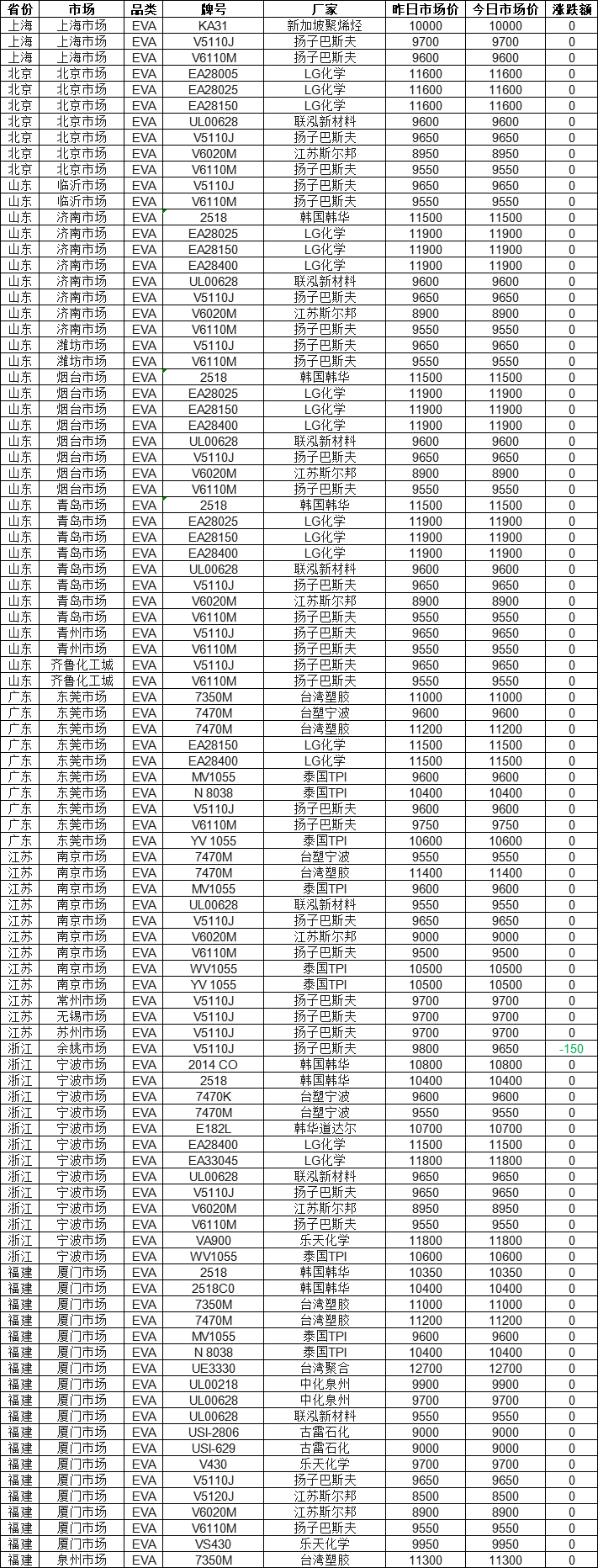 Today's EVA Market Brief: According to statistics from Zhuangsu Shijie, as of 4:00 PM on December 19, the EVA market across the country is stable with a slight decline! 99% of the market prices remain stable, with the maximum drop being 150 yuan. Cur