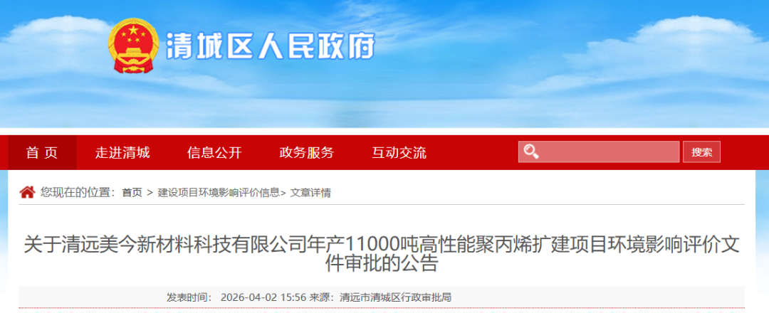 On April 2, the environmental impact assessment for Qingyuan Meijin New Materials Technology Co., Ltd.'s expansion project, with an annual production capacity of 11,000 tons of high-performance polypropylene, was approved. Qingyuan Mei Jin New Mater