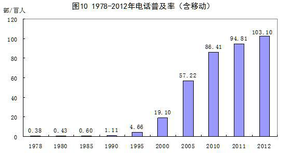 据统计,我国的固定电话用户从 1978 年的 192.5 万户,到 2012 年底,提高到了 2.8 亿户,增长 143.5 倍,电话普及率也从 0.38% 提升到了 103.1%。