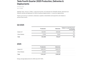 ①特斯拉披露,去年Q4共交付418,227辆新车,全年交付1,636,129辆; ②中国电动车巨头比亚迪早些时候披露,2025年全年销售电动车225.67万辆; ③唯一的亮点是储能部署数据再创新高。