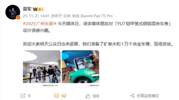 快科技 11 月 21 日消息,小米创办人,董事长兼 CEO 雷军今天发文称,广州车展今天媒体日,很多媒体朋友对 "YU7 铠甲笼式钢铝混合车身 " 设计很感兴趣。